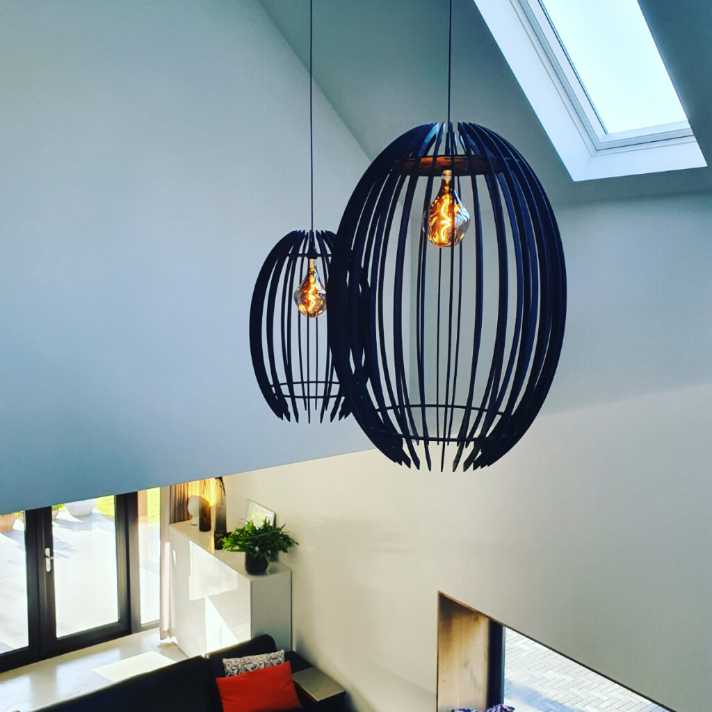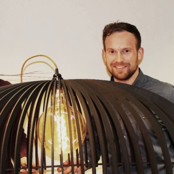 Gerben comienza a diseñar y poco después nace la lámpara colgante Innofique Ellipse. Madera FSC, pintura a base de agua y material de instalación Fairtrade aseguran la primera lámpara sostenible de Innofique Design. A finales de 2017, cuando llega el momento de presentar Innofique Design al gran público en la feria VT Wonen & Design, a Gerben se le pide diseñar una lámpara para un atrio de 6 metros de altura. La lámpara colgante Innofique Ovo nace.